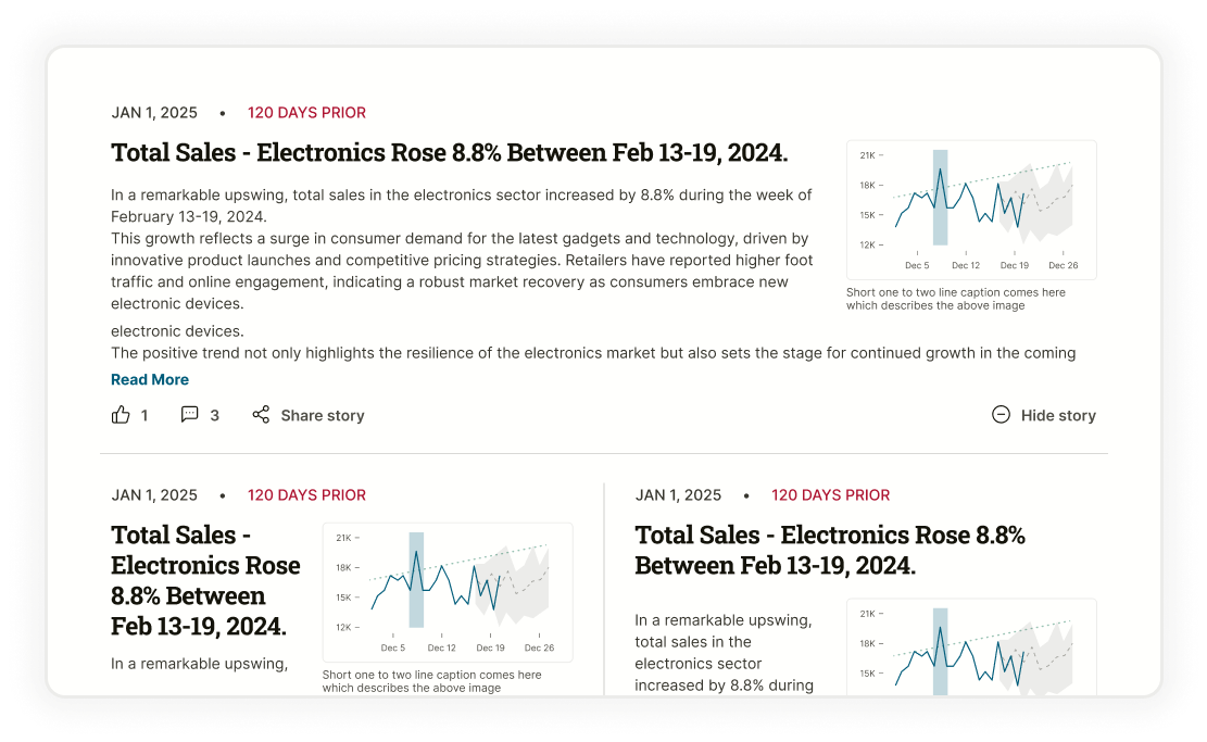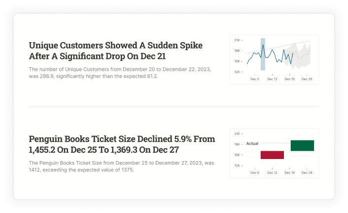 Insights by PetaSight continuously delivers data insights to business leaders in a dynamic news feed rather than via a traditional static dashboard. Insights appear in a visual, easy-to-understand, mobile-friendly manner. Explanations are intuitive and visual. Monitored metrics are presented with context and trends.