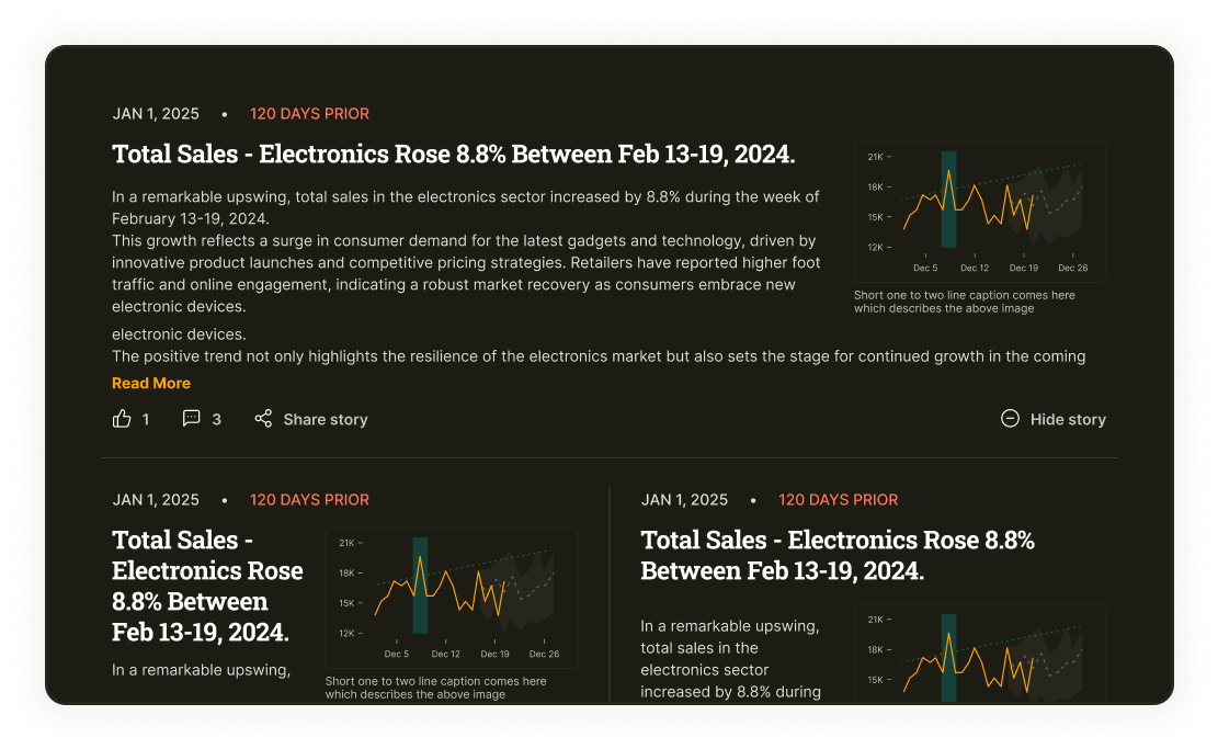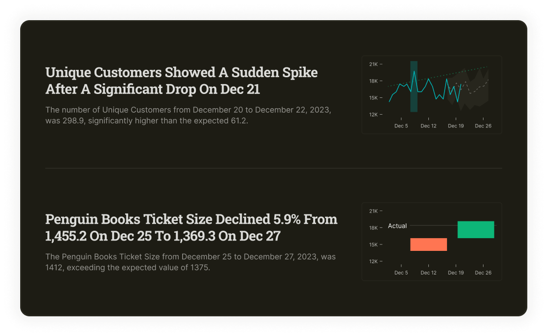 The considerable time leaders spend going back-and-forth with data analytics teams, is now eliminated. Executives can manually investigate data stories and make decisions with the click of a button.